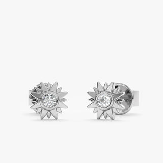 These 0.06 CT Round Starburst Sun Stud Moissanite Diamond Earrings in 925 sterling silver feature a dazzling starburst design, showcasing sparkling round moissanite diamonds that radiate brilliance. Perfect for adding a touch of celestial charm to any outfit, these earrings are ideal for everyday wear or special occasions.