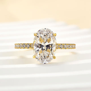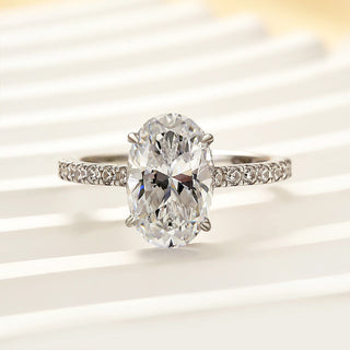 Radiating elegance, this 2.5CT Moissanite engagement ring showcases a captivating oval cut center stone accented by a hidden halo and delicate pave diamond details. As a unique engagement ring, it combines the brilliance of moissanite with the classic charm of a diamond ring for a truly breathtaking look. Perfect as an engagement ring, diamond engagement ring, or wedding ring, it's a timeless symbol of love and commitment.