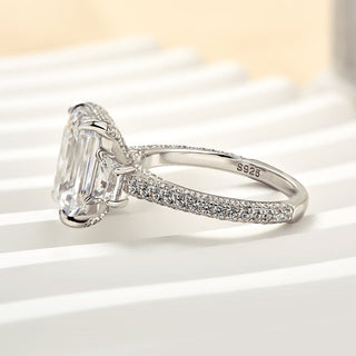 Celebrate timeless elegance with this 4.5CT Emerald Cut Three Stone Pave engagement ring. The striking emerald cut center is flanked by two brilliant stones, creating a radiant and balanced silhouette. This moissanite engagement ring combines the fire of moissanite with the shimmer of pave-set diamonds, offering the look of a classic diamond ring. Crafted for those who seek a unique engagement ring with luxurious charm. A breathtaking diamond engagement ring and perfect wedding ring to mark your forever.