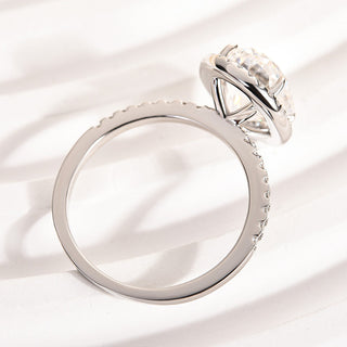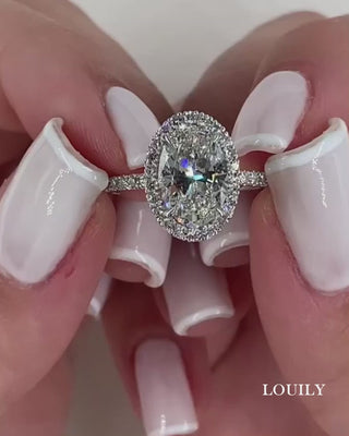 Make a bold statement with this 4.5CT Oval Cut Halo Pave engagement ring. The radiant cut center stone sparkles with unmatched brilliance, surrounded by a halo for a modern twist. This moissanite engagement ring offers the luxury of a diamond ring with ethical elegance. A stunning and unique engagement ring that blends timeless design with contemporary style. Perfect as a diamond engagement ring or cherished wedding ring for your forever moment.