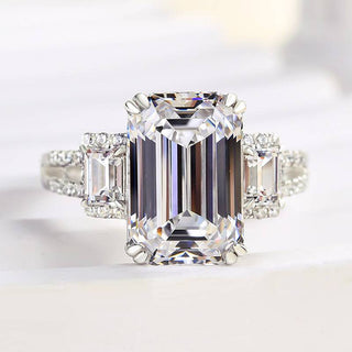 This 5.0CT Moissanite engagement ring features a striking emerald cut center stone flanked by two side stones, all set on a pave diamond band that adds extra sparkle and elegance. A truly unique engagement ring, it combines the timeless beauty of a diamond ring with the brilliance and ethical appeal of moissanite. Perfect as an engagement ring, diamond engagement ring, or wedding ring, it’s a radiant symbol of your everlasting love.